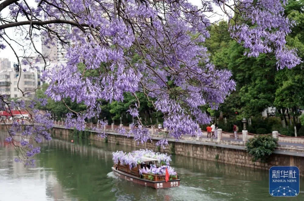 连日来,云南省昆明市教场中路、盘龙江畔的蓝花楹竞相绽放,吸引众多市民和游客前来打卡拍照,共赴紫色花海之约。