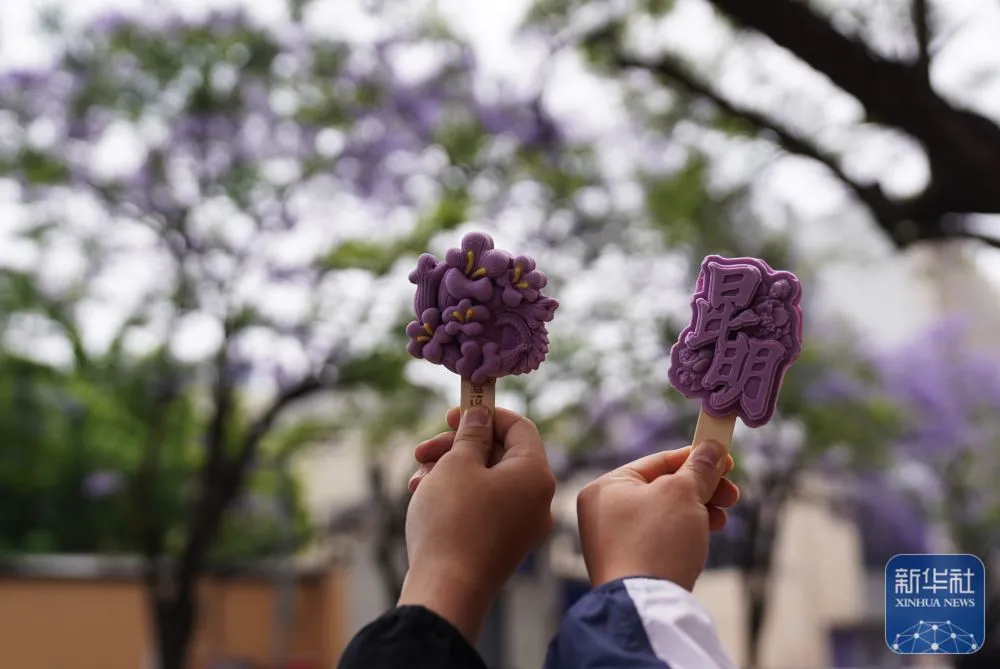 ↑ 4月26日,游客在昆明市教场中路展示文创雪糕。