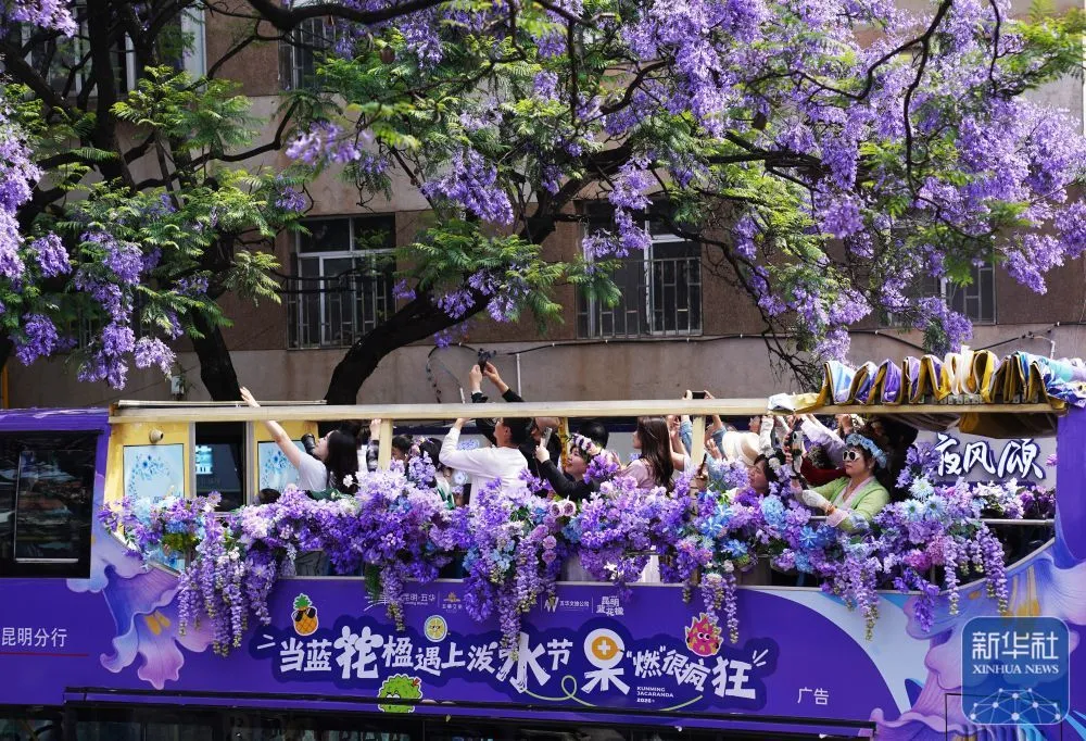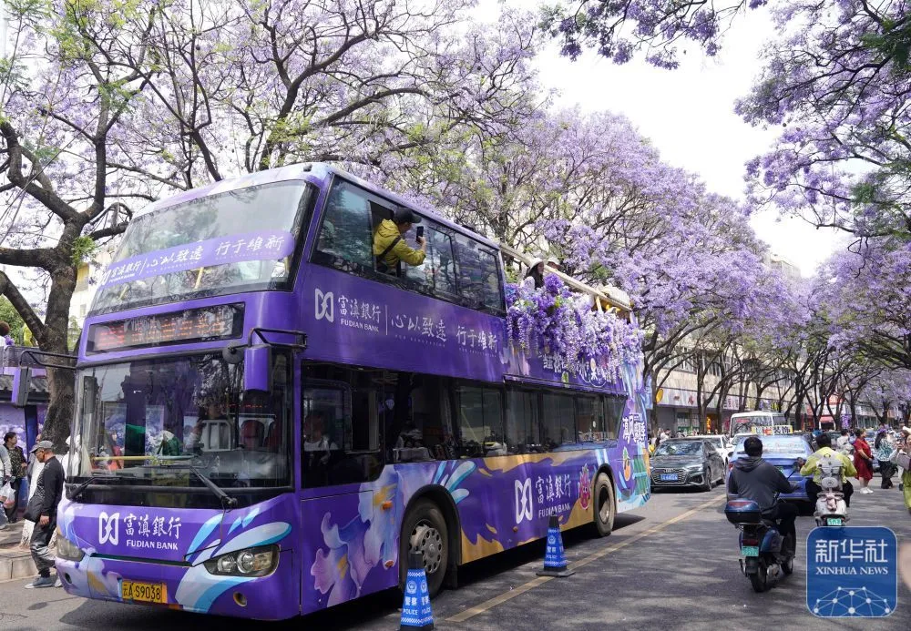 ↑ 4月26日,游客乘坐蓝花楹观光巴士经过昆明市教场中路。